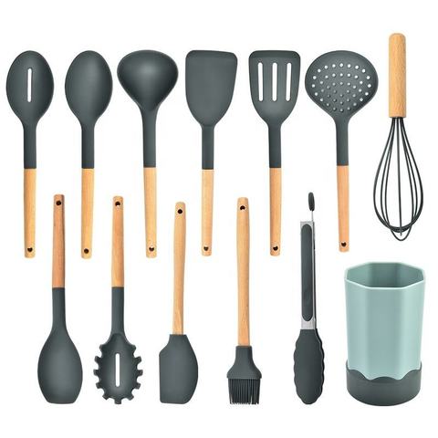 Juego de utensilios de cocina de acero inoxidable, respetuosos con el medio ambiente, cucharas ranuradas, cucharones, manijas de madera de silicona en caja para uso doméstico en la cocina